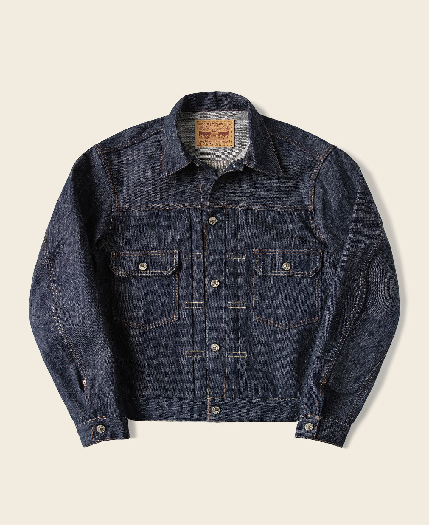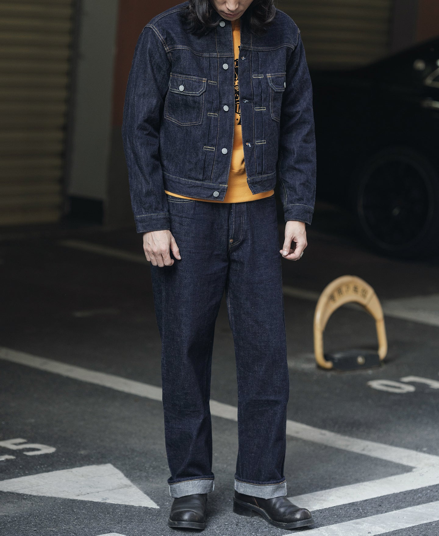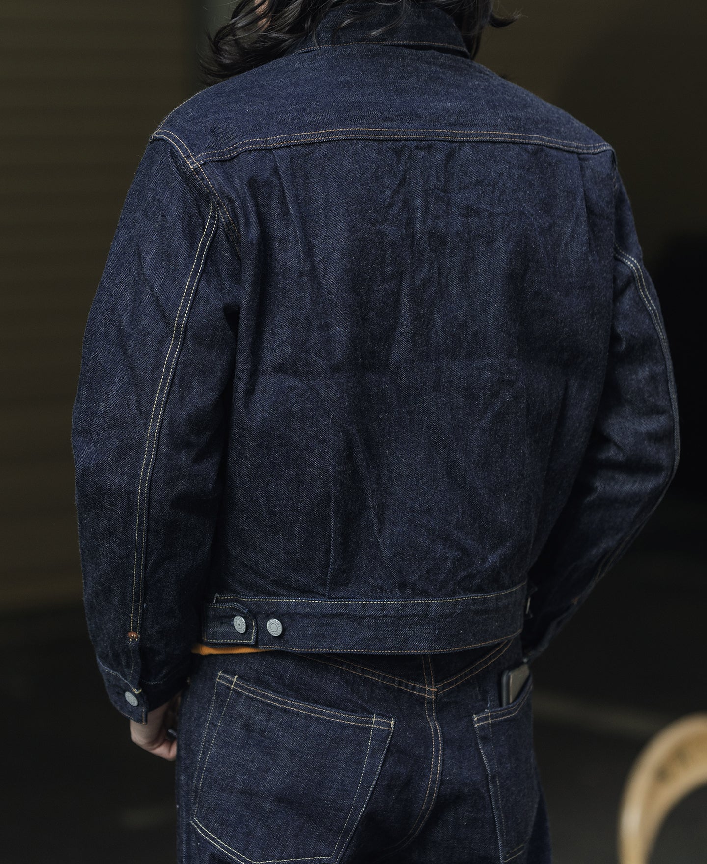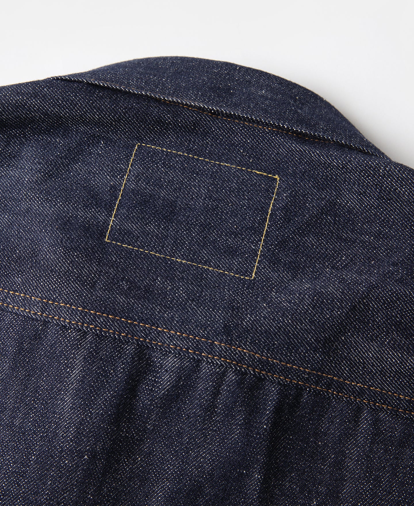 Inspired by the 1952 second-generation denim jacket, this reproduction features a trimmer, more fitted silhouette with two symmetrical chest patch pockets. The traditional back cinch has been removed and replaced with adjustable side tabs. A cardstock patch substitutes the leather patch of earlier models, while iron buttons and iron rivets complete the design, echoing the practical, utility-driven details of the era.