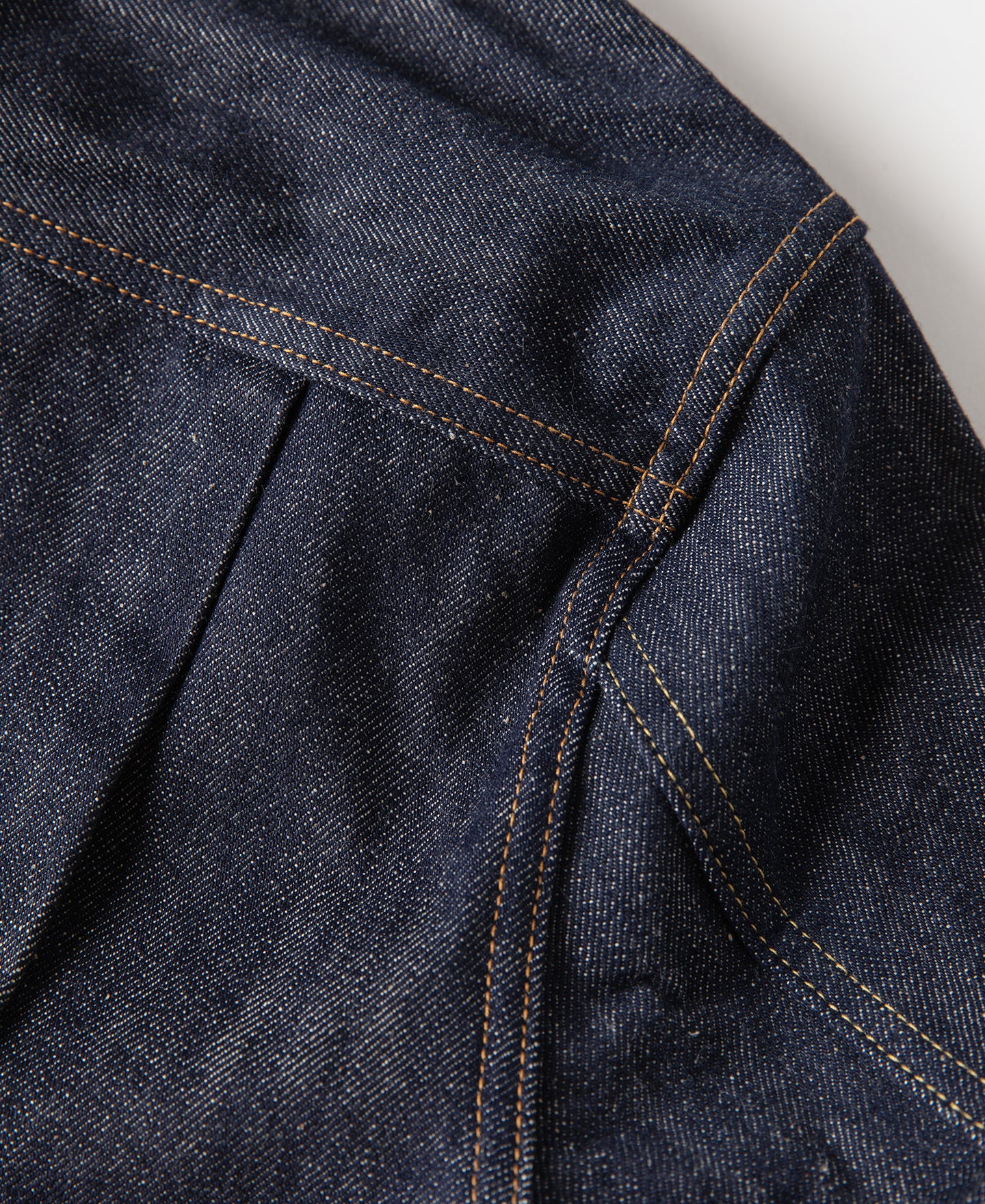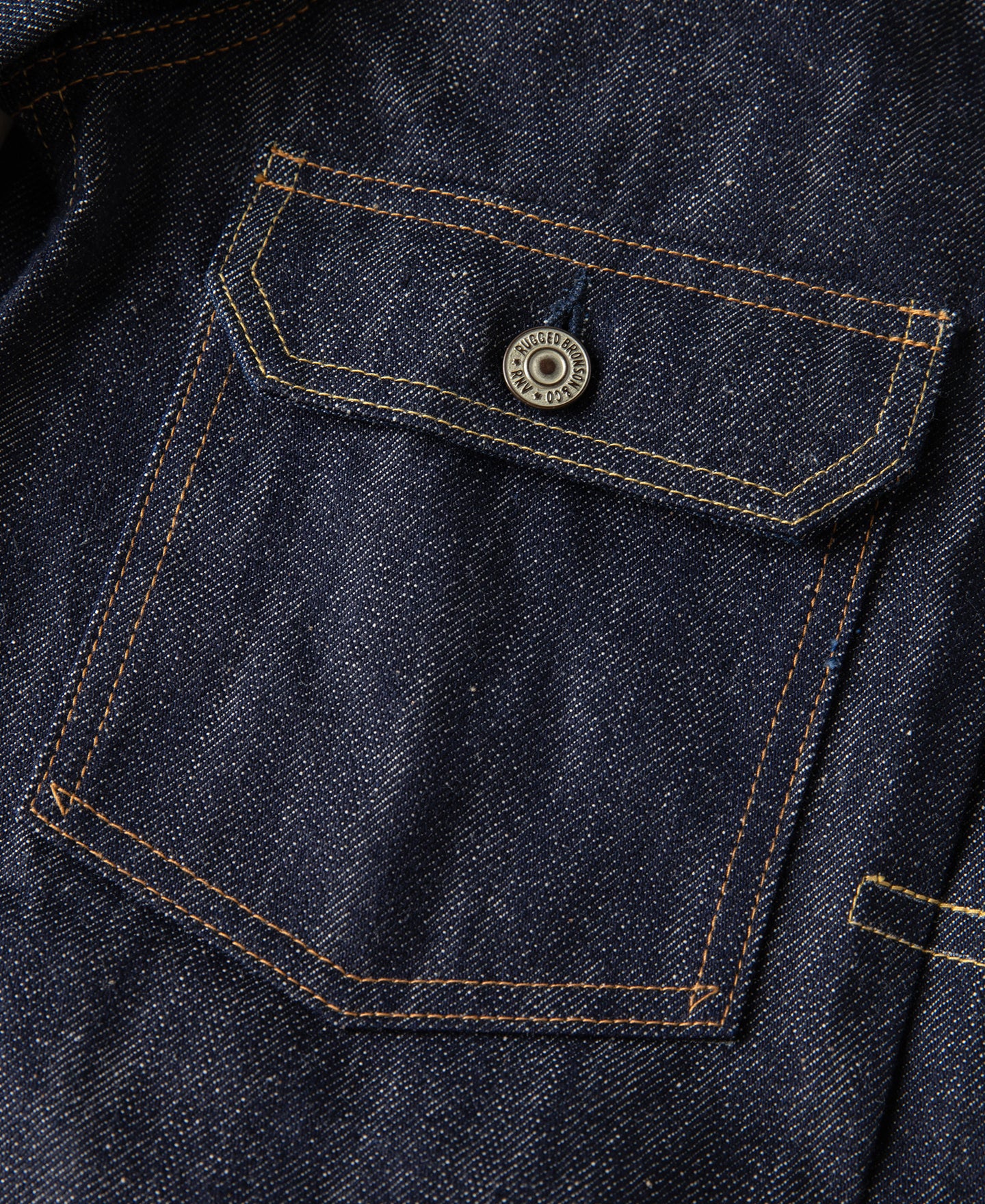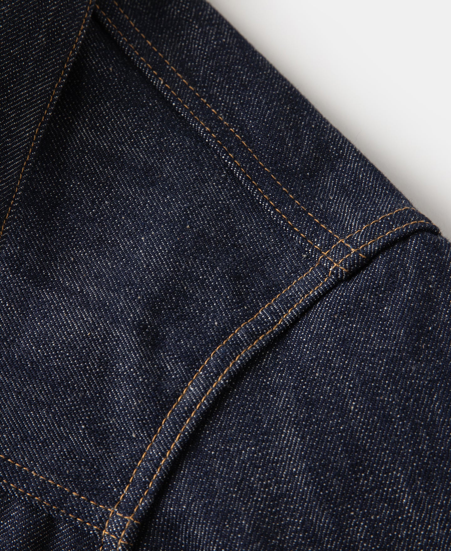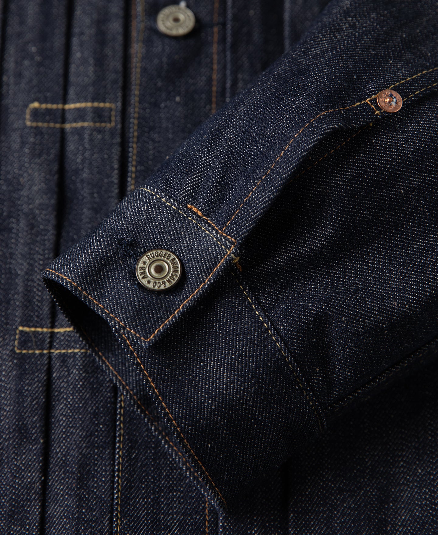 Inspired by the 1952 second-generation denim jacket, this reproduction features a trimmer, more fitted silhouette with two symmetrical chest patch pockets. The traditional back cinch has been removed and replaced with adjustable side tabs. A cardstock patch substitutes the leather patch of earlier models, while iron buttons and iron rivets complete the design, echoing the practical, utility-driven details of the era.
