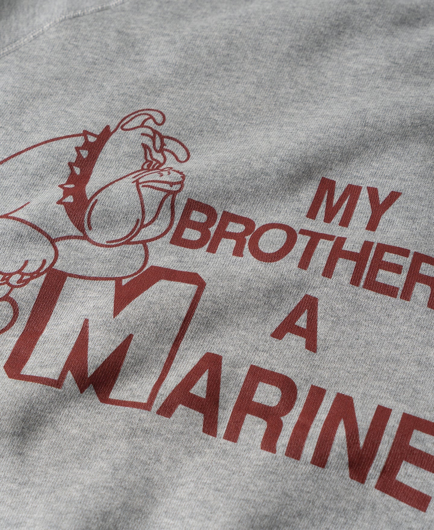 This sweatshirt is a replica of the classic design from American base stores in the 80s and 90s, encapsulating the military style and spirit of that era. Featuring the"Marine" bulldog cartoon pattern on the chest, it not only replicates the silhouette but also evokes a memory.