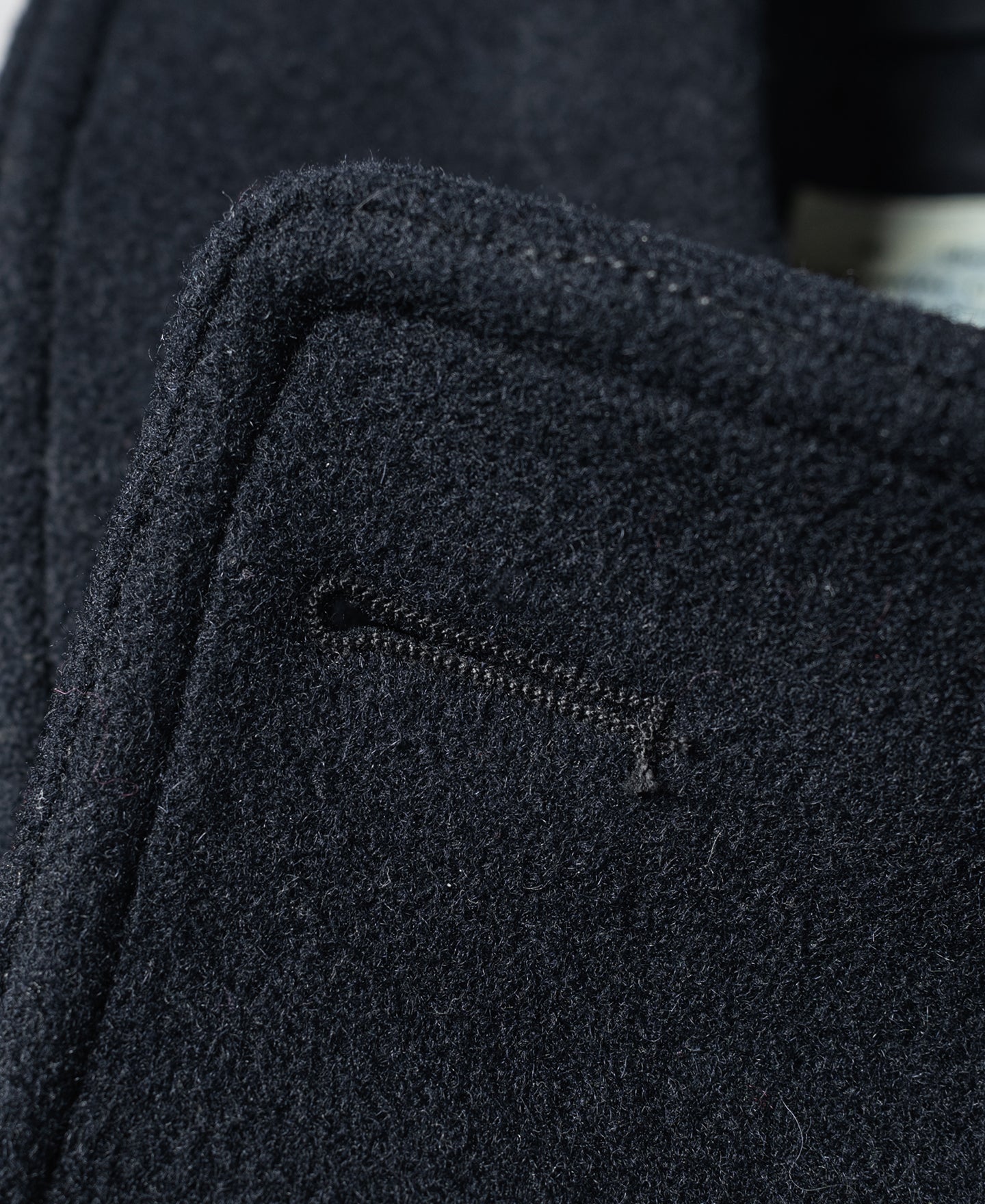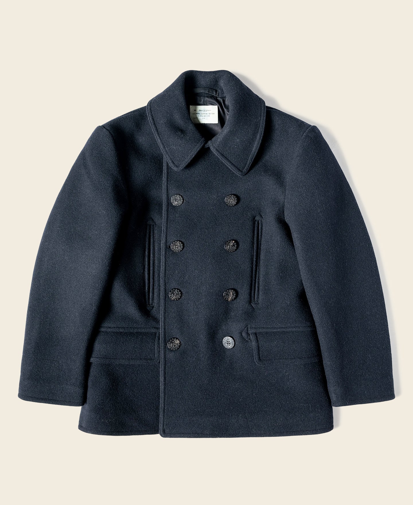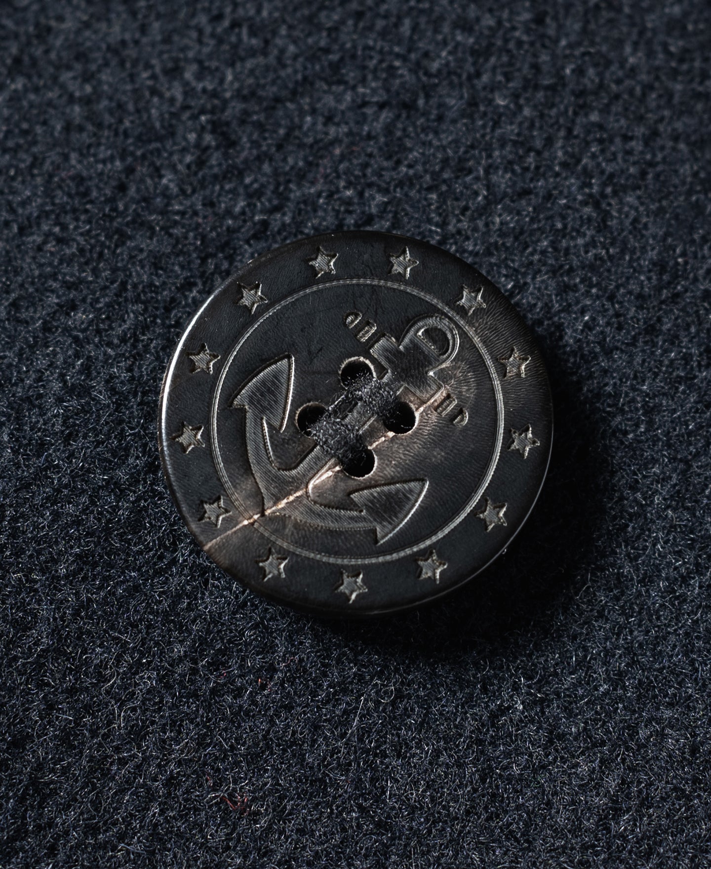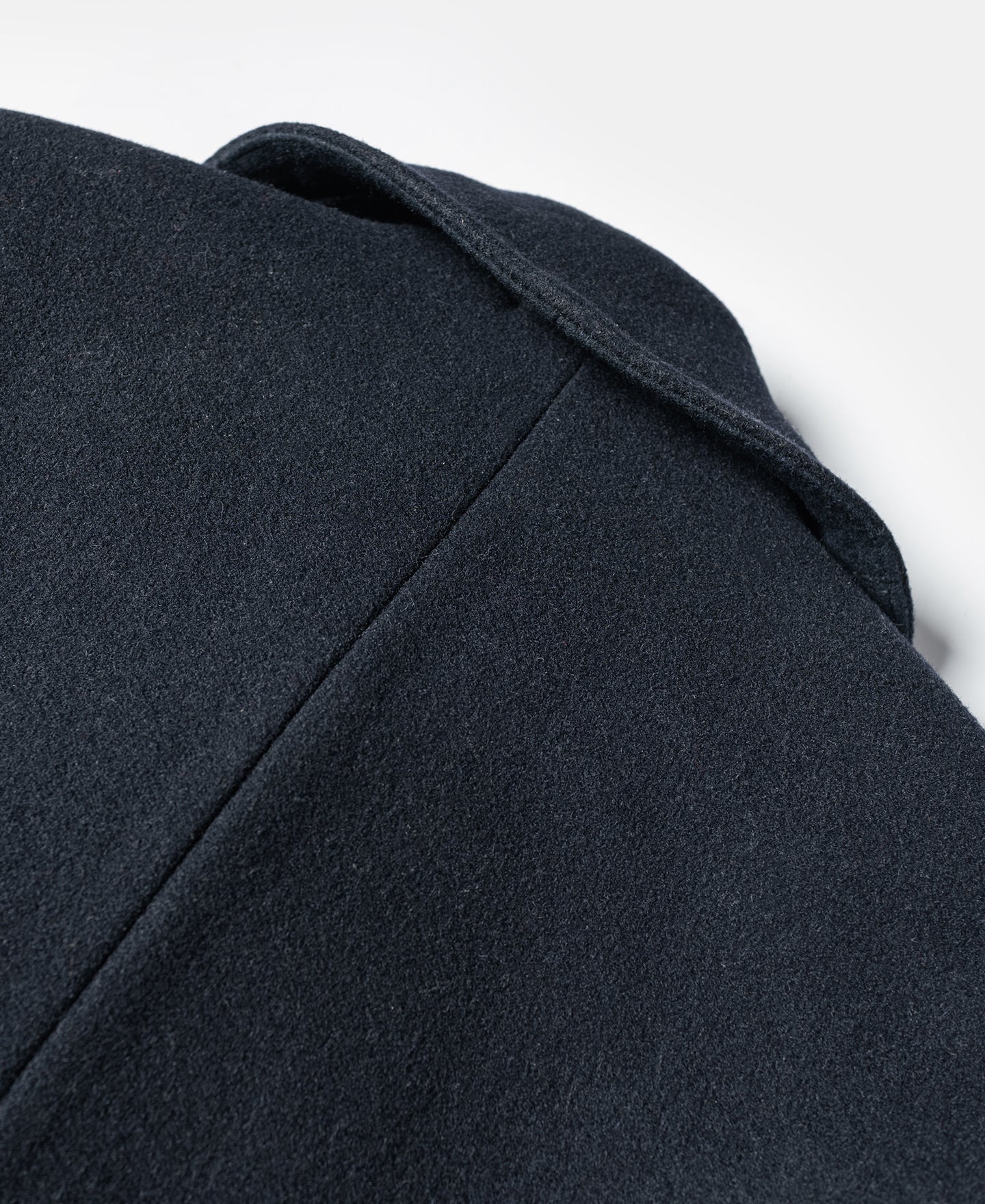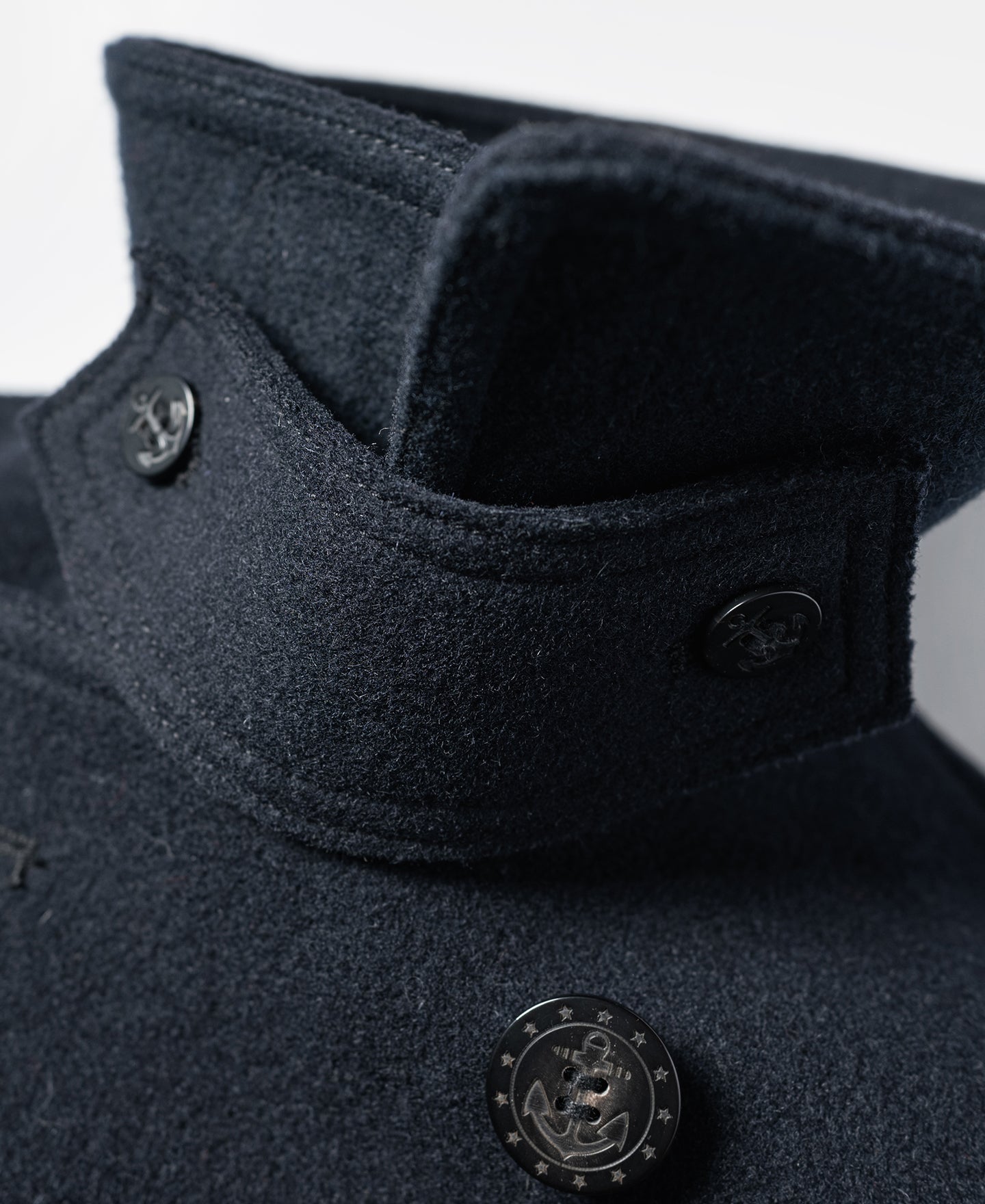 Inspired by the 1913 U.S. Navy Peacoat, this double-breasted overcoat is crafted from a dense 1000g (36 oz) pure wool melton, delivering exceptional warmth and structure. The broad convertible collar folds neatly for a classic silhouette and can be turned up and secured for added protection against harsh winds. A tailored fit ensures a secure, enveloping feel while maintaining the iconic naval profile. The practical length and rear vent offer ease of movement, balancing functionality and refinement. Finished with hand-sewn, oversized thirteen-star horn buttons for authentic military character, this coat embodies both durability and timeless style.