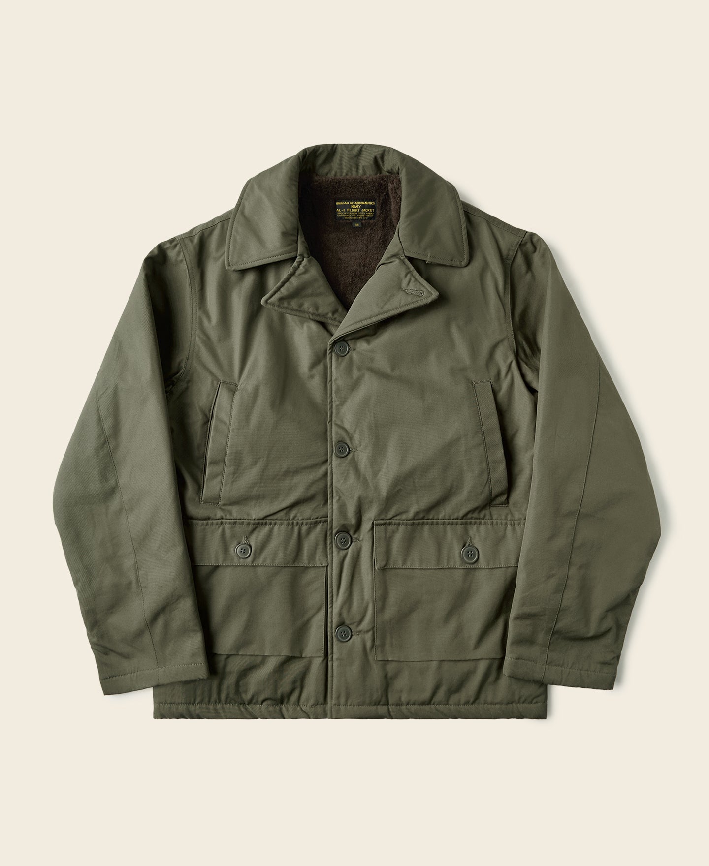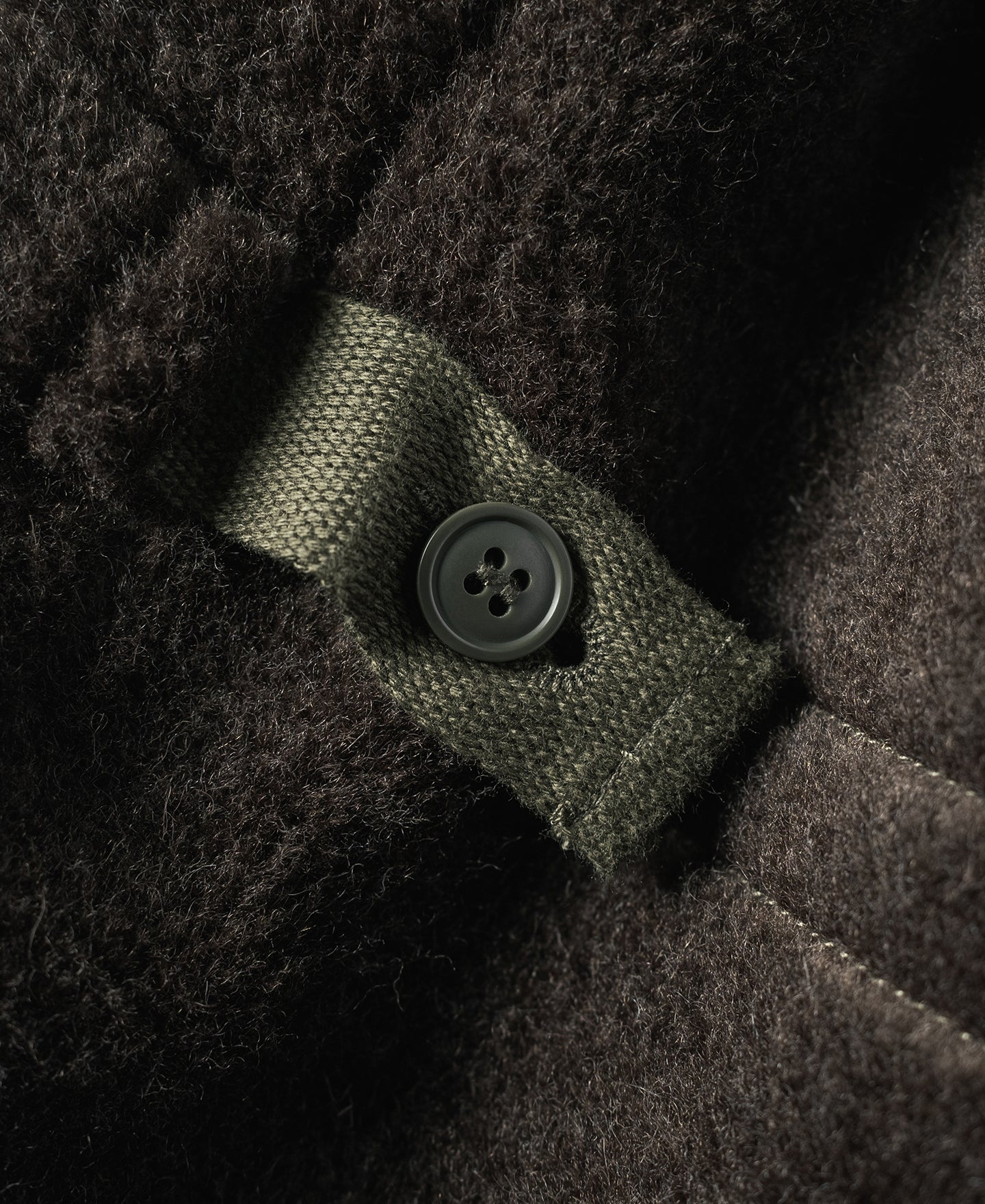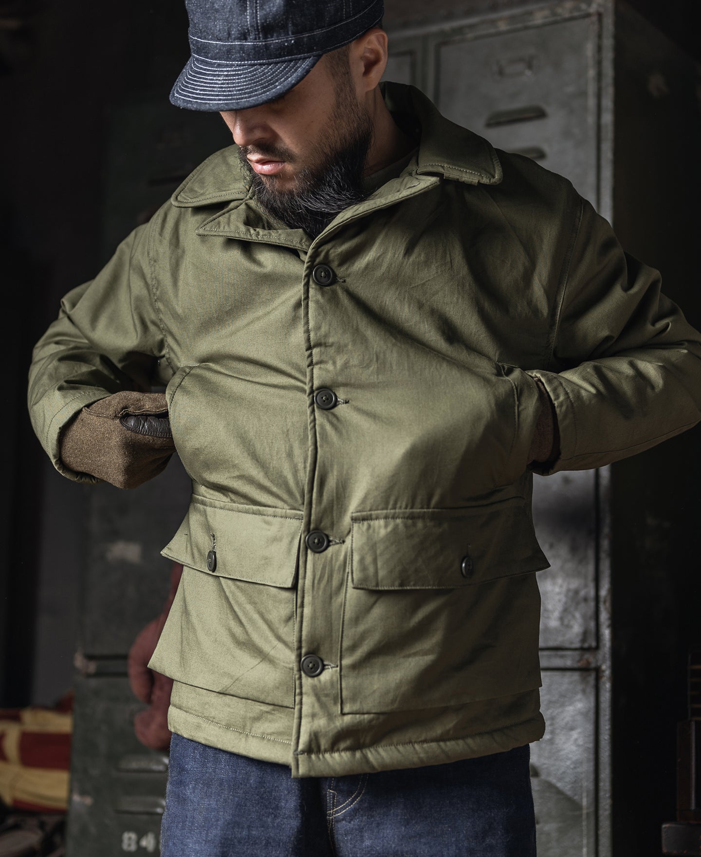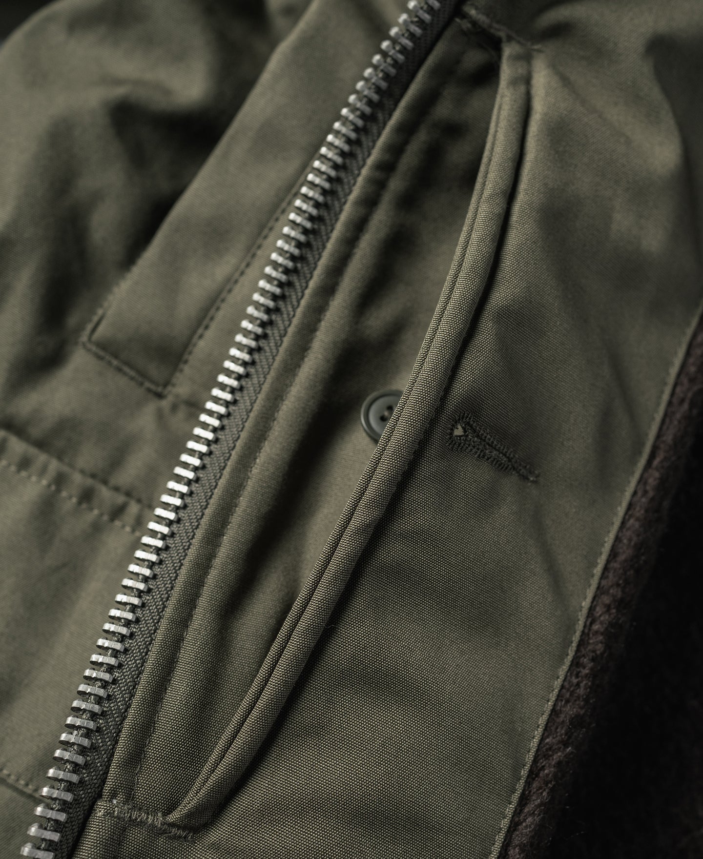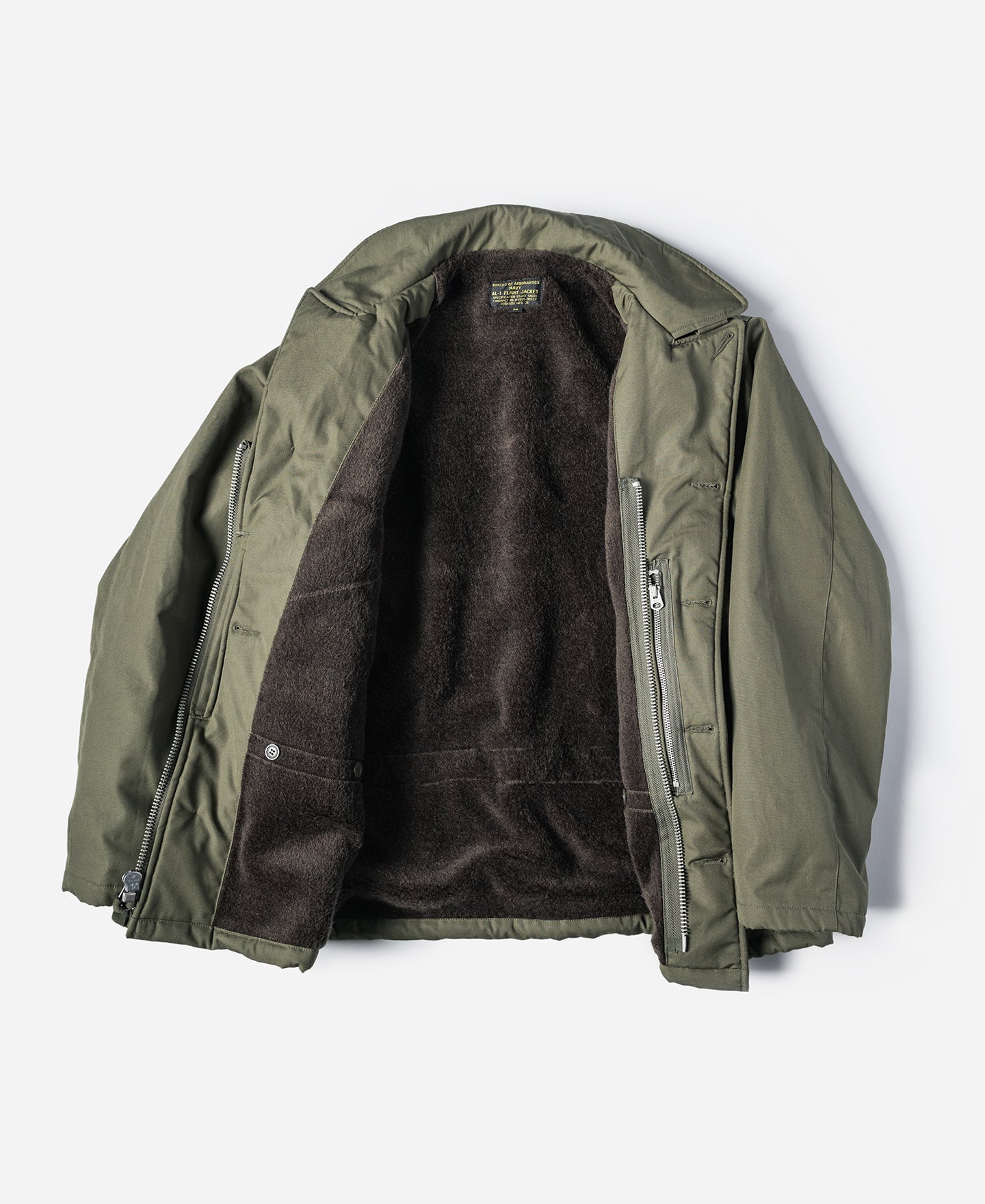 The AL-1 (55J13) is a mid-length jacket with a field jacket-like lapel appearance. The jacket is closed by a zipper and had the button-type front fly provides good warmth. The body is made of flocking wool, the sleeve is made of wool, there are hand pockets on both sides of the chest, and there are wool threaded cuffs to strengthen warmth, there are two large three-dimensional storage bags at the hem. Inside the jacket, there is a pocket on each side, one side is zipped closed, the other side is button closed.