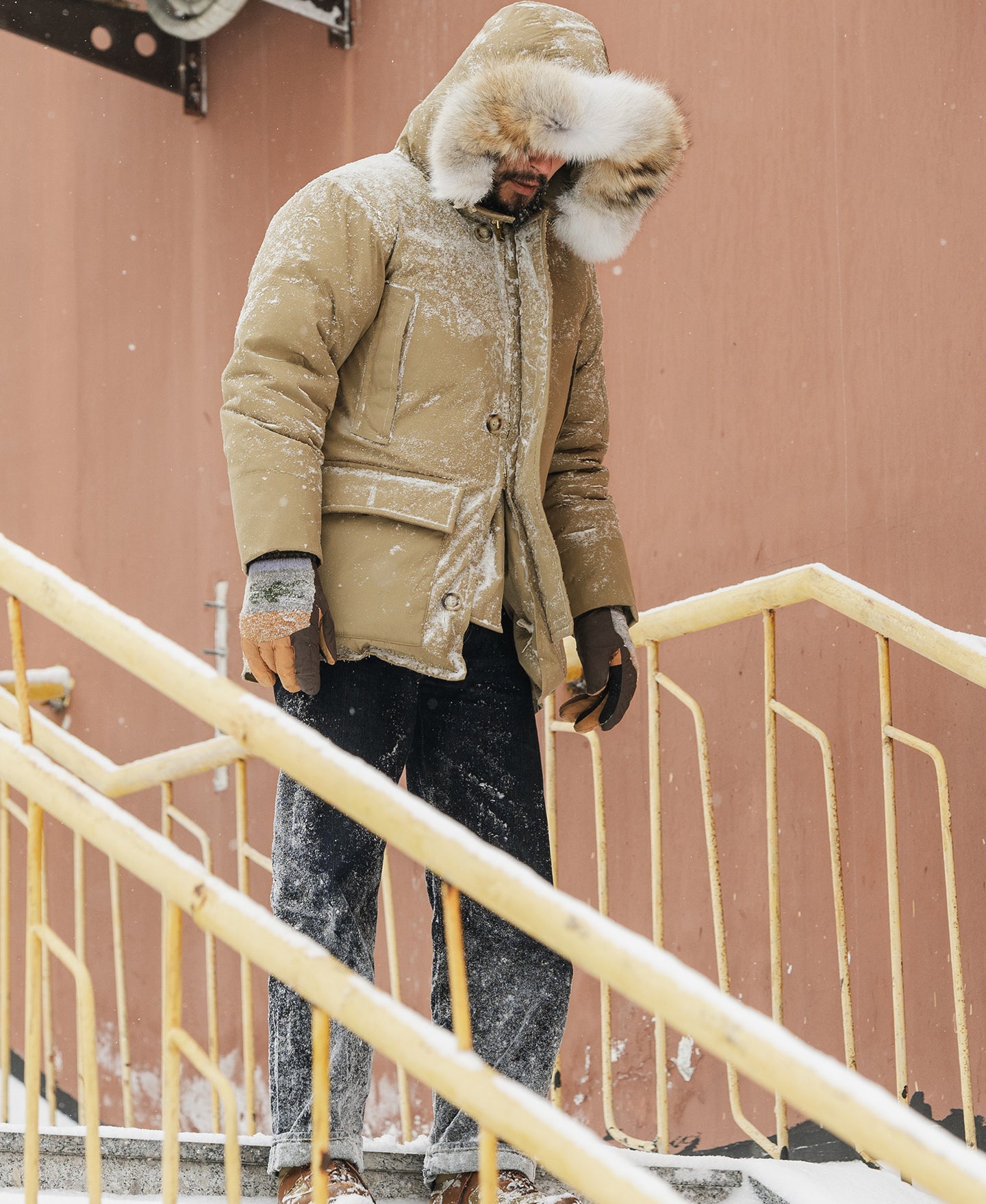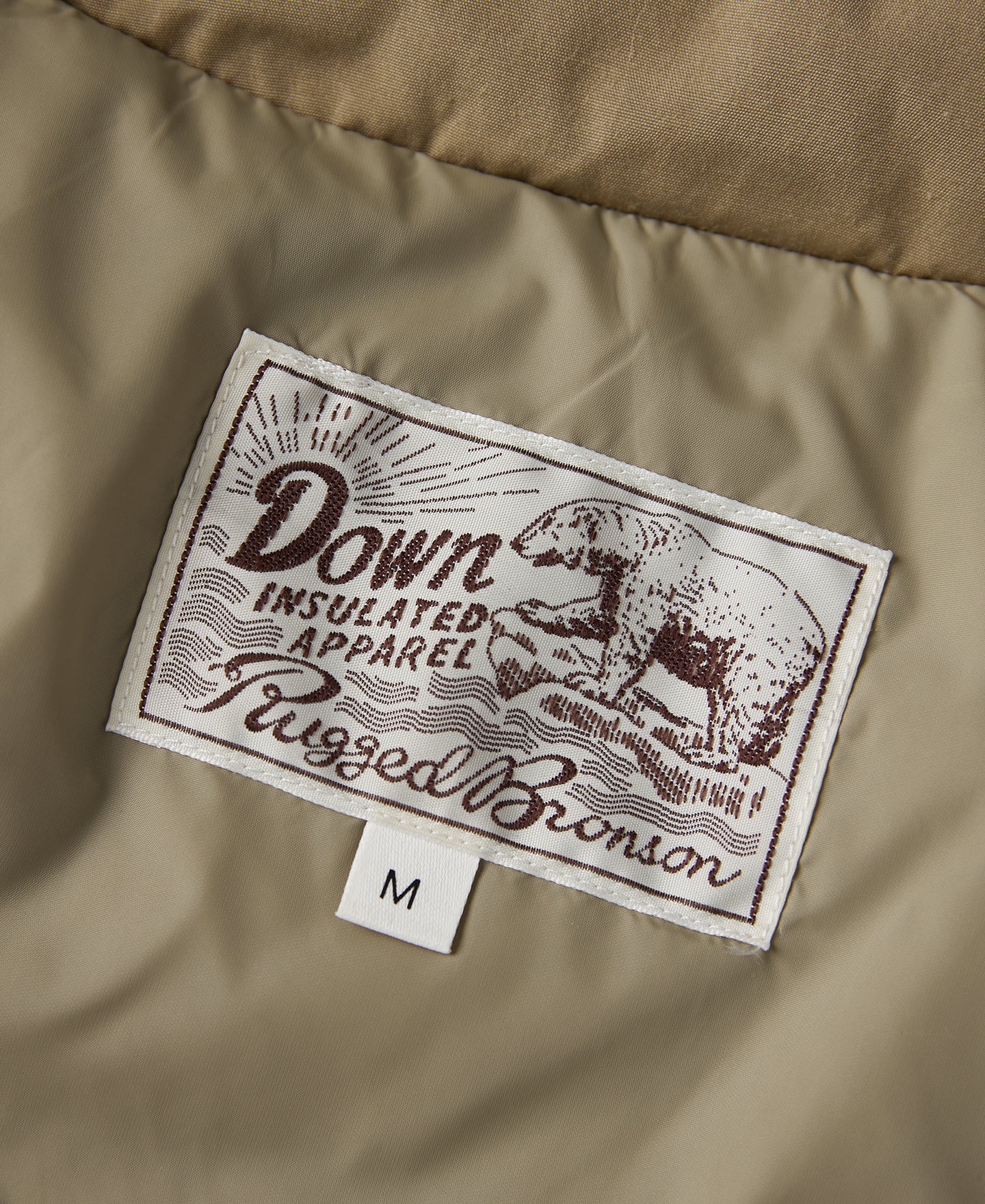 The outer shell is made from a tough nylon-polyester blend that offers wind and weather resistance, while the interior is filled with 380–400g of 650-fill duck down for superior insulation. A full brass TALON zipper with a wind flap provides double closure against the cold, and rib-knit cuffs are hidden inside the sleeves to lock in warmth.