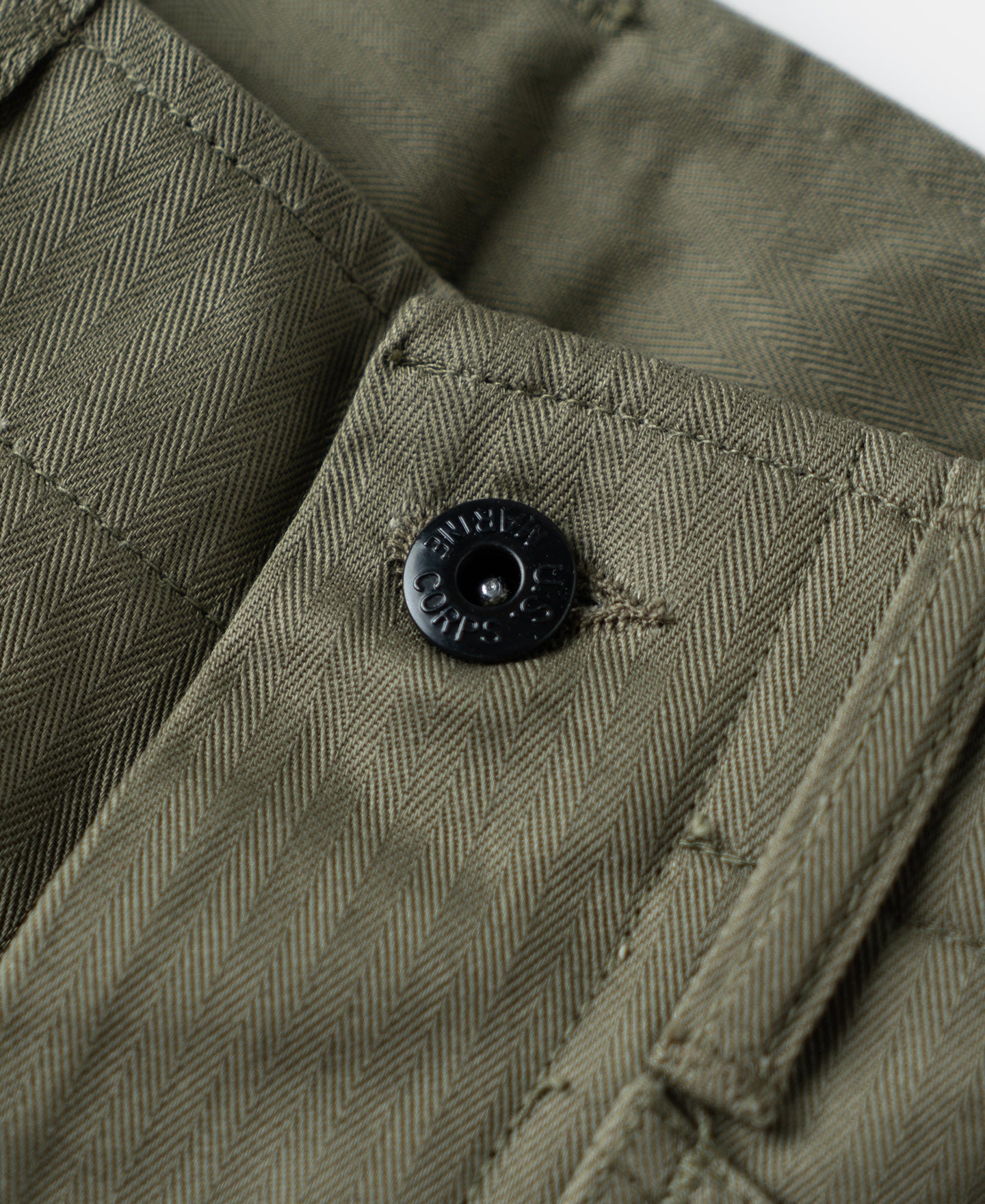 - Belt loops. Button fly with a buttoned closure. Black USMC brass shank button.